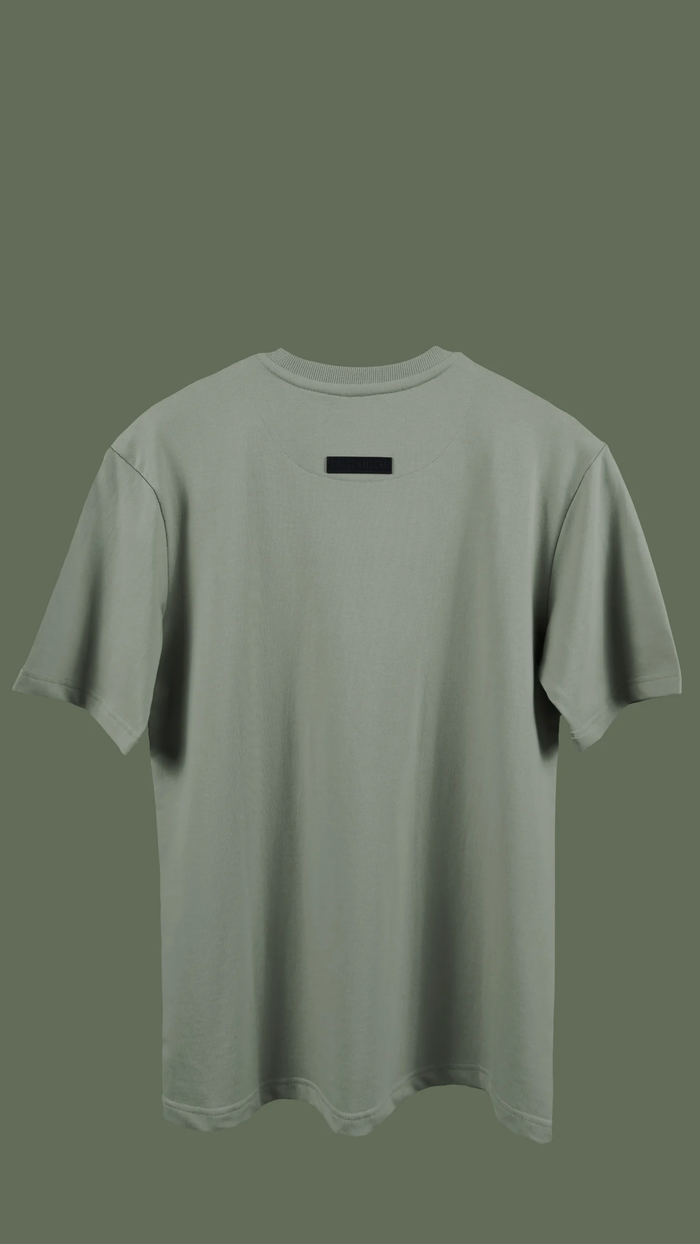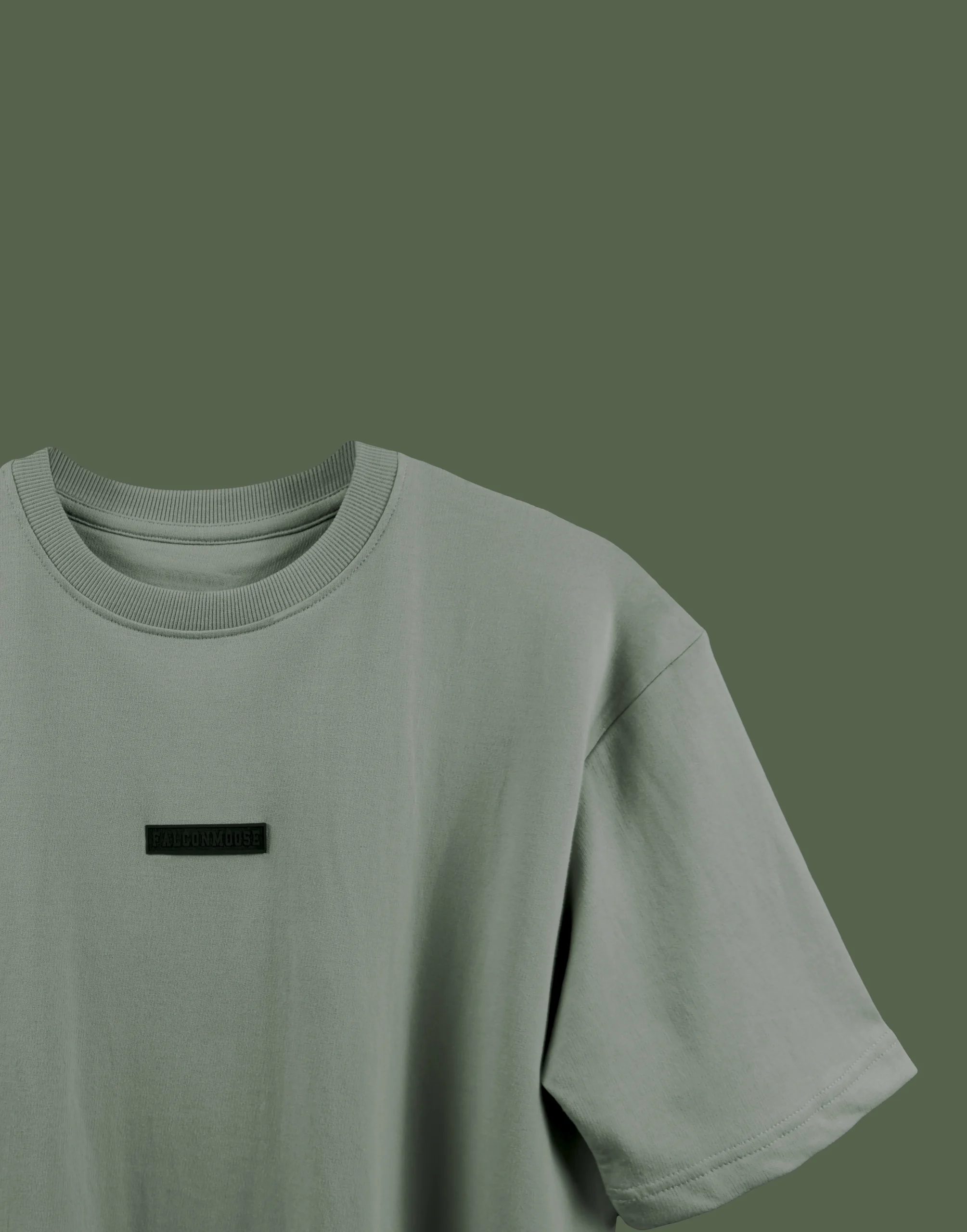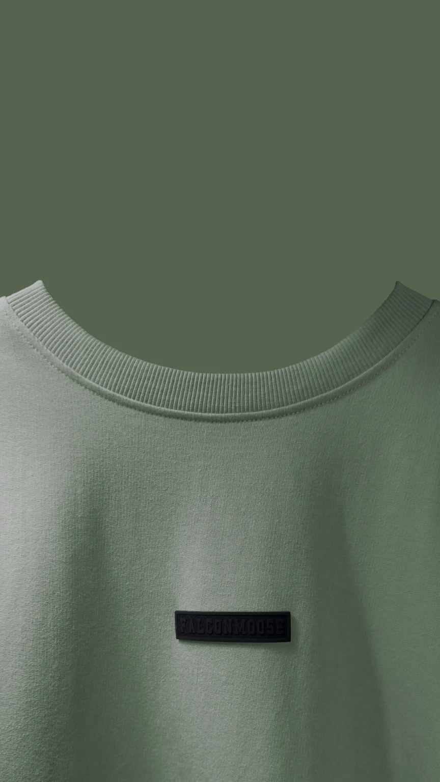 At the chest, a bold black silicone “Falconmoose” logo defines identity and strength. The black-on-pistachio contrast is carefully selected to create a sharp yet elegant visual balance, ensuring the branding stands out without overpowering the garment.